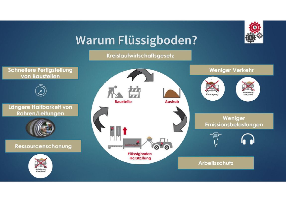 Mit dem Flüssigbodenverfahren kann man fast jeden Aushubboden in einen zeitweisen fließfähigen Zustand versetzen, ihn wieder einbauen und hat, nachdem der Boden wieder refixiert ist, annähernd gleiche Eigenschaften des Ausgangsbodens erhalten.